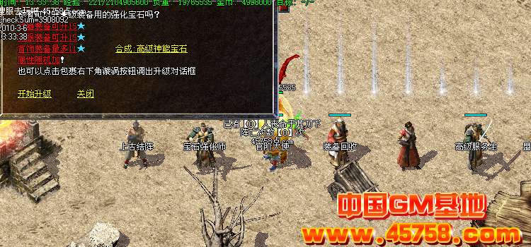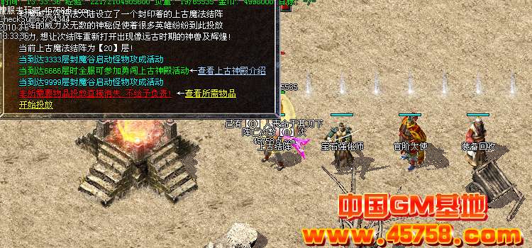 [上古结阵]:玩家在游戏打宝中.可将装备进行回收.每达回收一定程度.系统将自动怪物攻城!