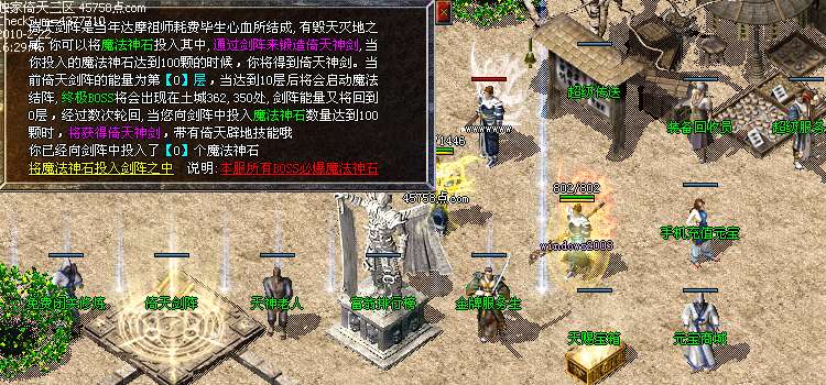 活动④: 倚天剑阵,不断的向剑阵中投入魔法神石,达到100颗有机会奖励倚天剑一把,本服38个BOSS,每个BOSS必爆魔法神石一颗,每小时刷新一次BOSS.