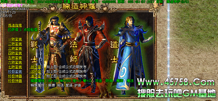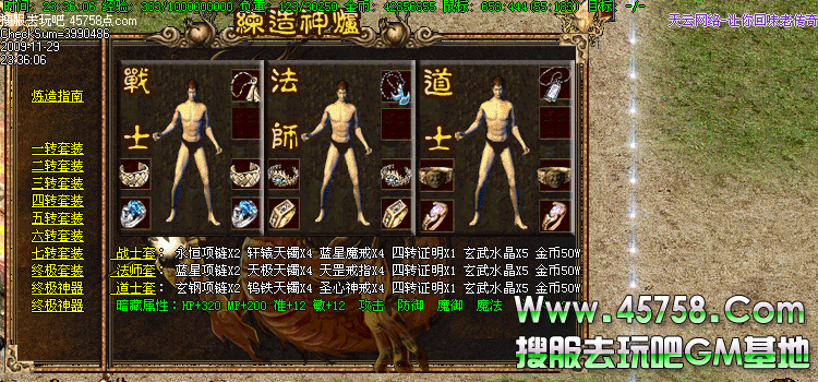 神界魔甲(男) 防10-16 攻击5-8 魔法道术7-9 需要等级55级(本套装备游戏中获得)