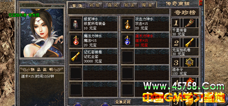5:本服最高攻击为幸运10套,土城地图开通升级幸运项链NPC,可以升级一点幸运,有几率失败,有一定难度,请玩家慎重选择。
