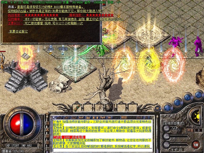 本服主要打宝地图有:幻境八层。十层。烟花之地。魔龙血域。龙渊血路。各大BOSS,均爆出全副所有装备,BOSS很具有挑战性。请大家组队前去。