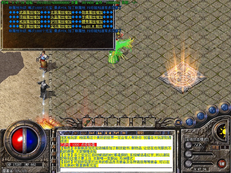 5:本服最高攻击为幸运10套,土城地图开通升级幸运项链NPC,可以升级一点幸运,有几率失败,有一定难度,请玩家慎重选择。