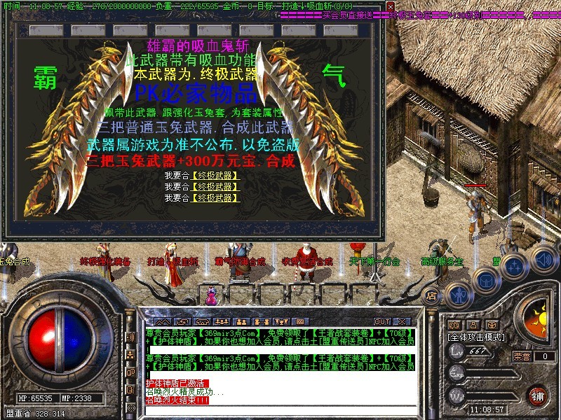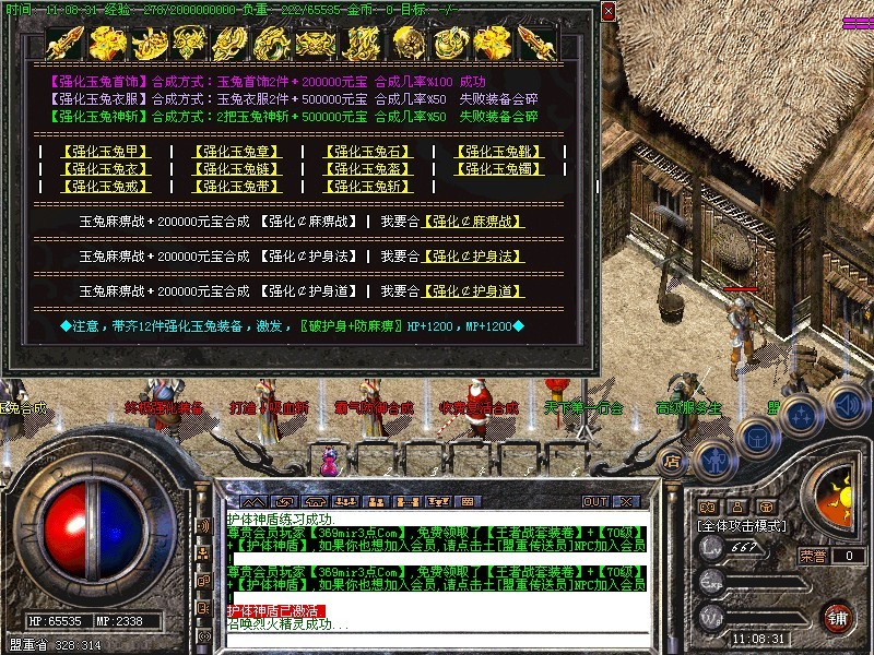 本服暴率较高,大家很快有玉兔级装备,稀世装备可以在土城合成非常简单,版本是在仿盛大1.89基础上,更新到了最新装备和装备技能