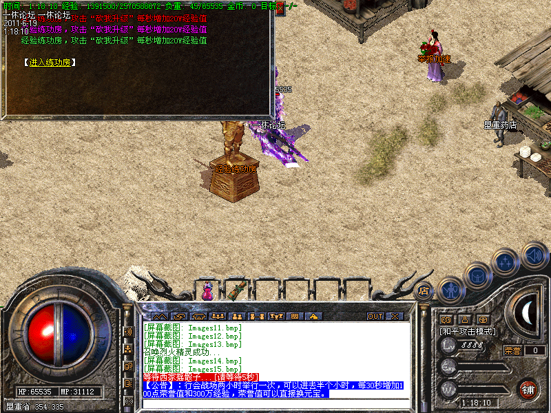 7本服行会战场两小时举行一次,可以进去半个小时,每30秒增加100点荣誉值和300万经验,荣誉值可以直接换元宝。