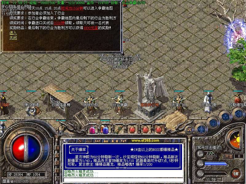 本服务器拒绝家族,47级号抢沙之间禁止登陆、禁止外援!号角││爆率1/1,开区第3天统一拿沙,占沙行会奖励5万元宝(守沙奖励1万││元宝),赶快召集玩家争夺这笔以外的财富吧--