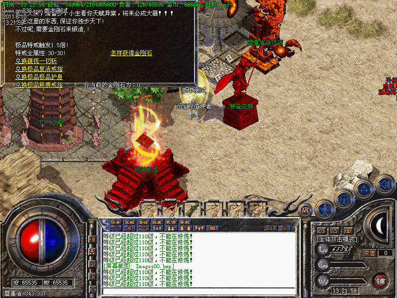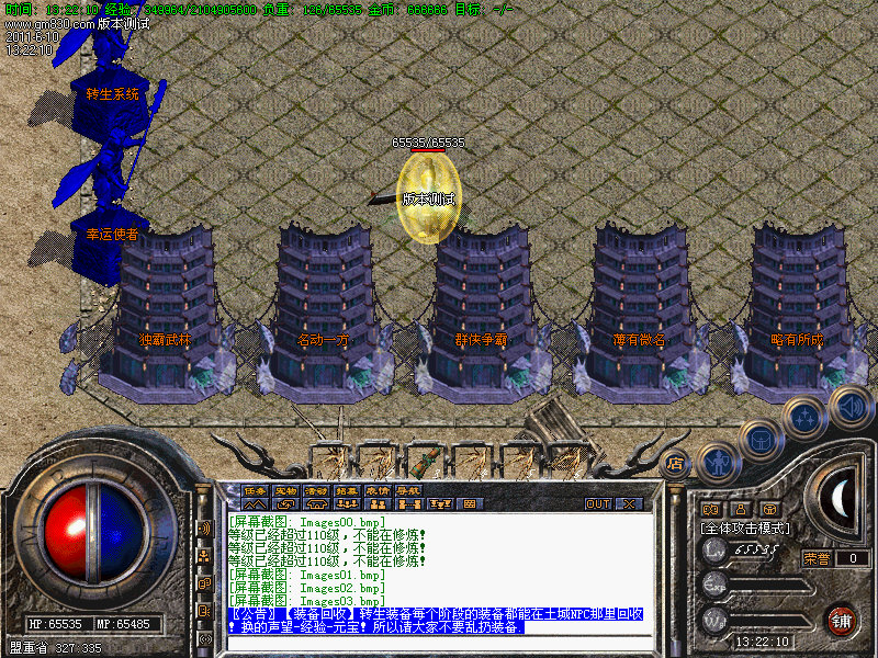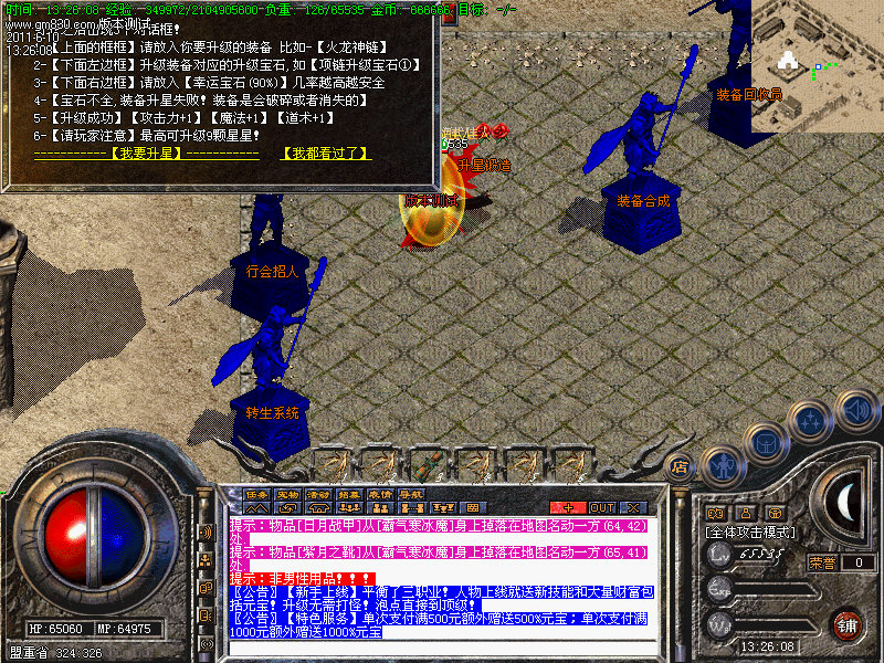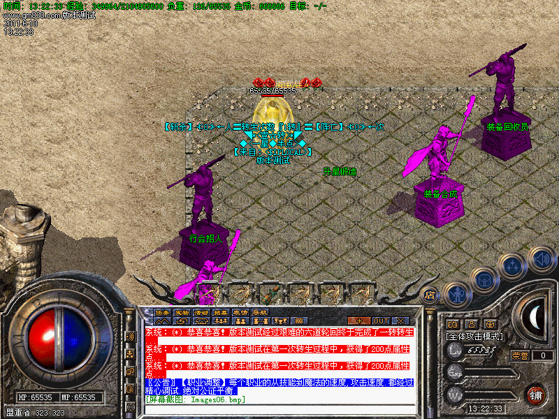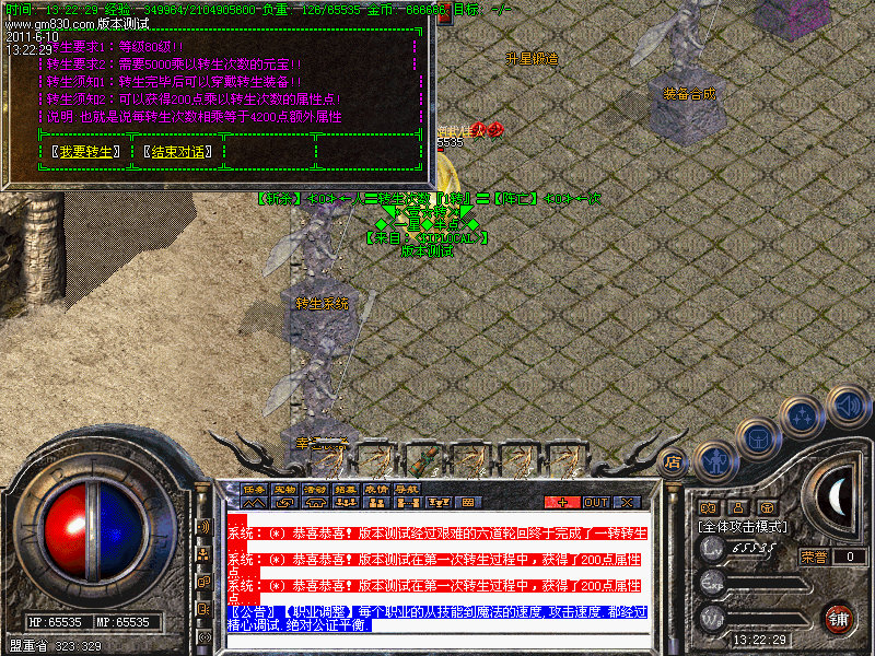 4.人物转生需要到盟重土城左边的转生雕像那里完成转生.转生后可获得属性奖励.还有酷炫的转生封号.