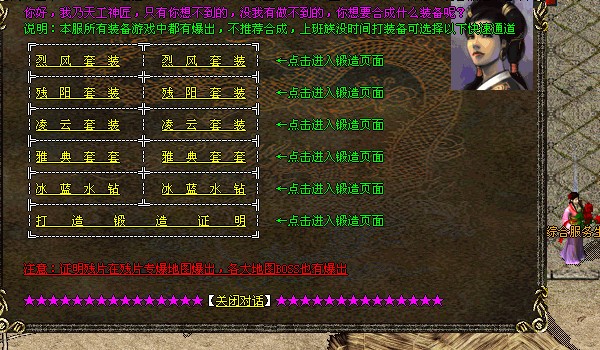 【公告】:本服4个高级地图,可爆出烈风,残阳,凌云装备,进入条件很简单,专为免费玩家开放的。