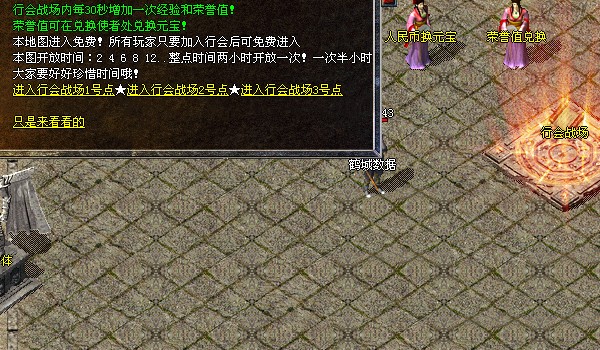 【公告】:行会战场两小时举行一次,可以进去半个小时,每30秒增加100点荣誉值和300万经验,荣誉值可以直接换元宝。