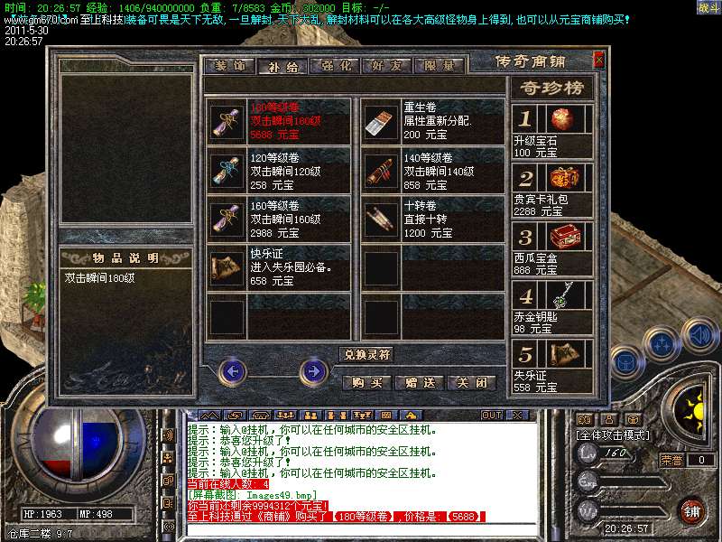 【游戏介绍】最新推出元宝系统功能,元宝兑换各种特殊物品及服务.<装备改名>.<元宝购物>.<神的恩赐>等等....