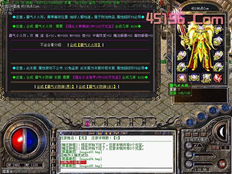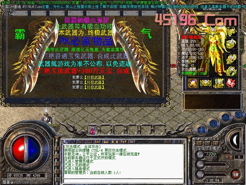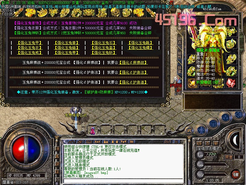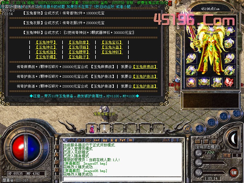 本服暴率较高,大家很快有玉兔级装备,稀世装备可以在土城合成非常简单,版本是在仿盛大1.89基础上,更新到了最新装备和装备技能