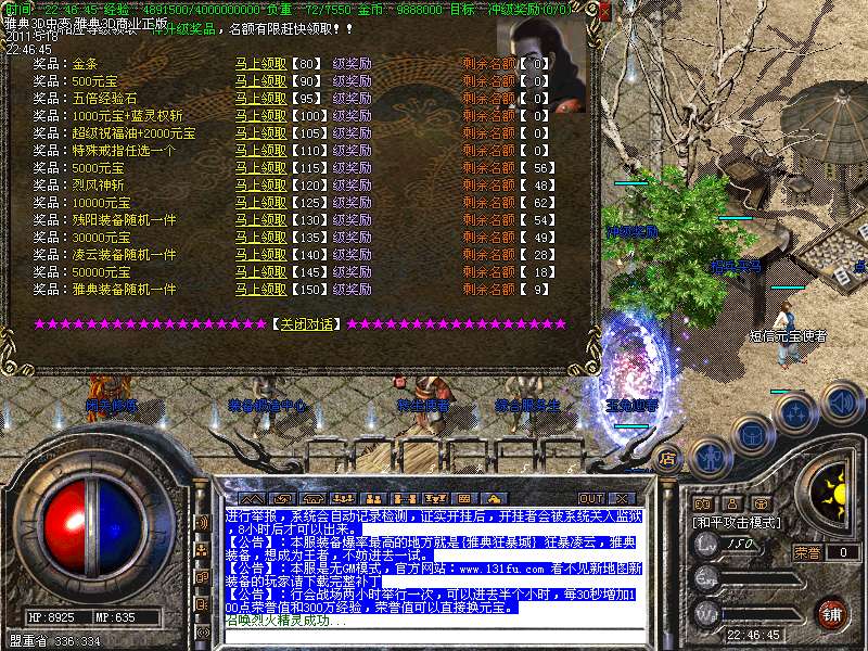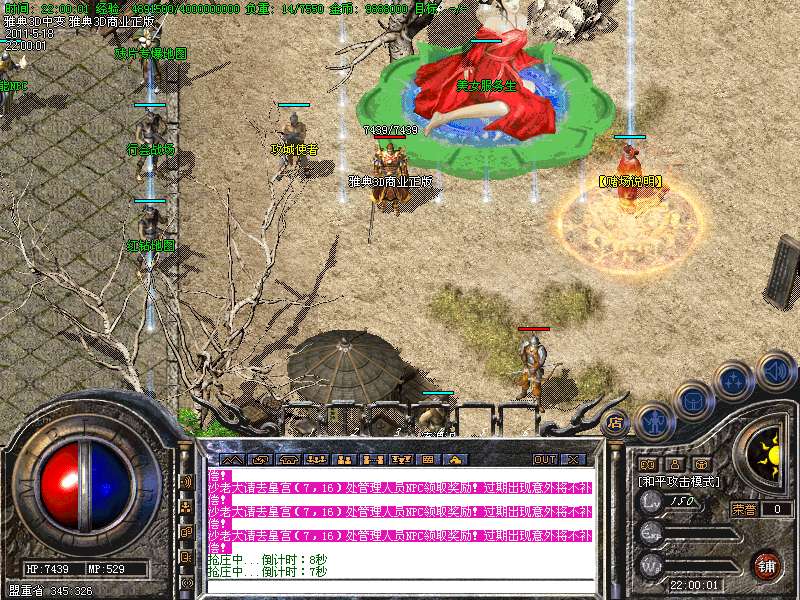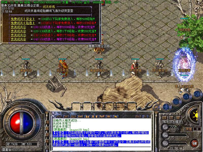 【特色6】;游戏行会战场两小时举行一次,可以进去半个小时,每30秒增加100点荣誉值和300万经验,荣誉值可以直接换元宝。