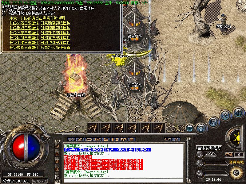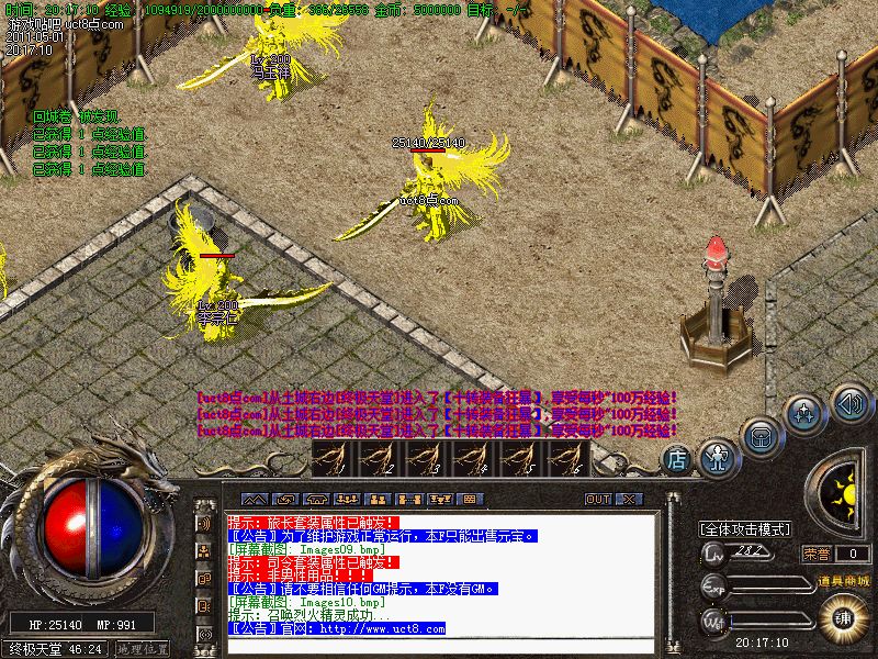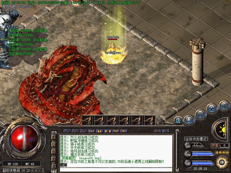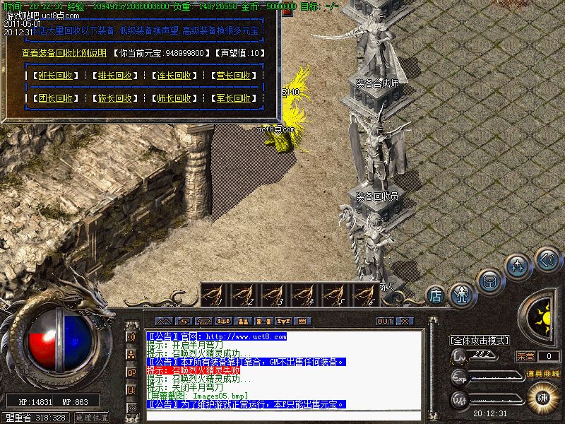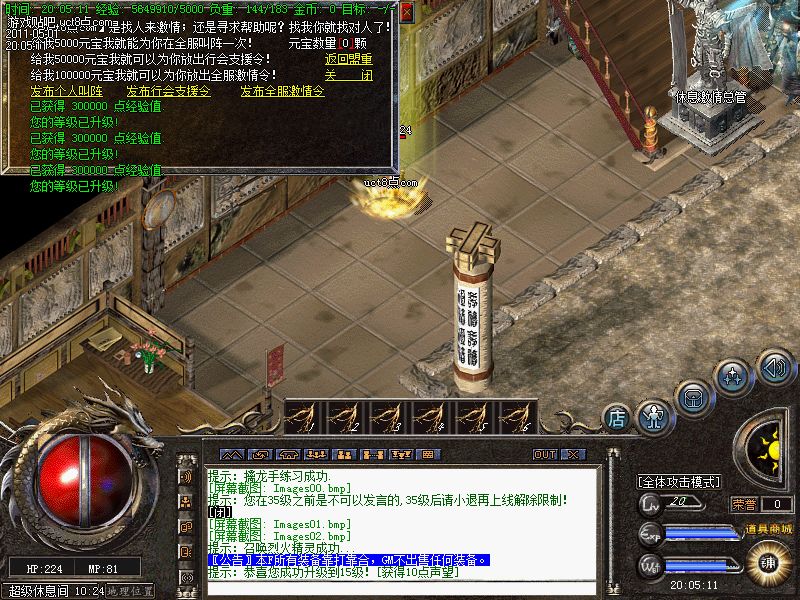【元宝回馈】休息间每半个小时刷一只元宝怪!会爆出大量财富!是玩家必争之地!并且元宝怪死的地点人物站上可每秒产生1000W经验,真 是太疯狂了.