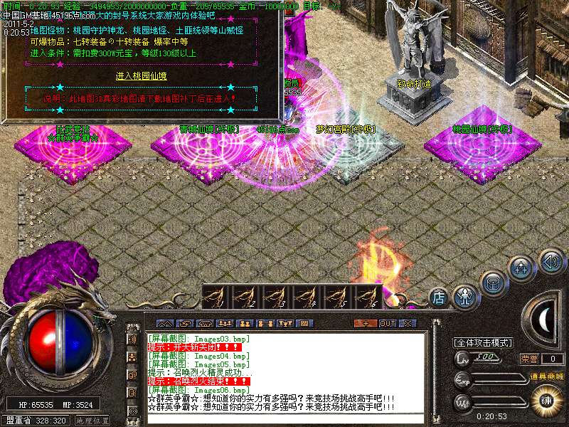 【转生系统】人物转生需要到盟重土城左边的转生雕像那里完成转生.转生后可获得属性奖励.还有酷炫的转生封号和名字变色.