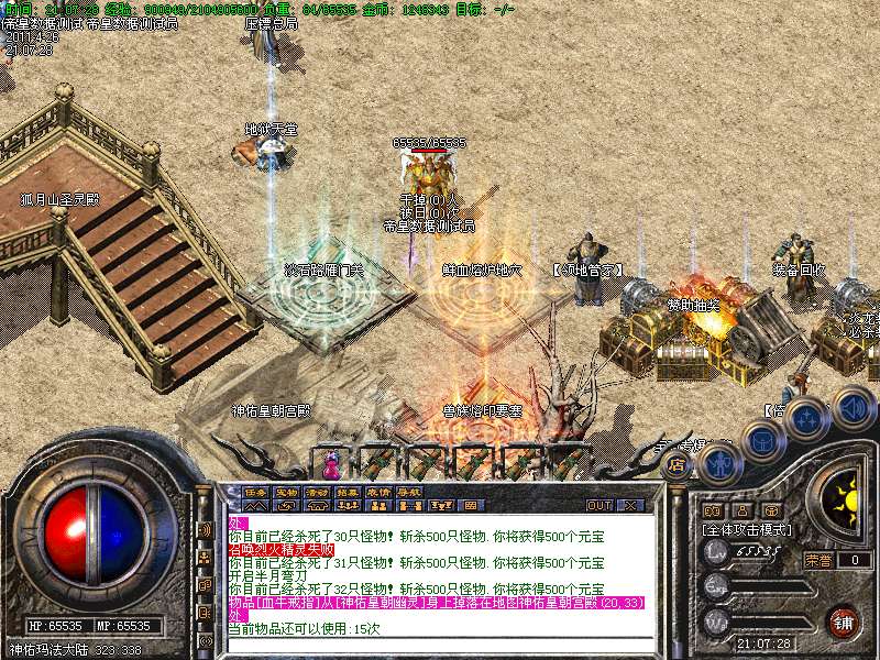 八.【特殊刷新】用魔法神石在土药旁边的魔法结阵可召唤出蚩尤.同时可获得丰富的奖品.--即本服的所有装备都可送出!