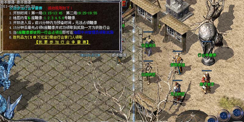 ⑥行会争霸:每天13:15及19:25各一场,每场奖励行会10万元宝