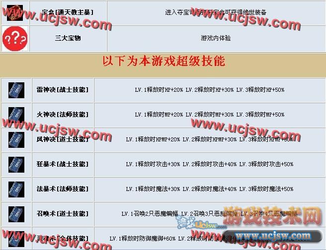 三大宝物:从[比奇省]进入火龙神殿内杀死火龙神,收集到7个龙魄,交给火龙使者即可在三件宝物中任选一件