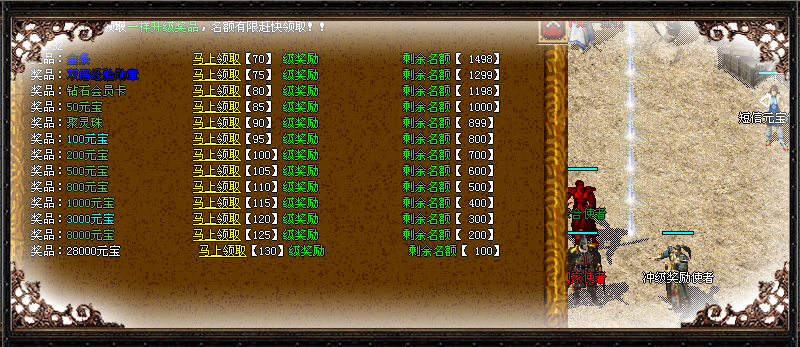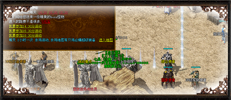 【沙城奖励】本服开区第二天举行大型集体攻城,行会老大无需递交头像,首任沙城主奖励二十万元宝+复仇一套,以后每天一次攻沙站,周六日及节假日再加一次,每天每次奖励两万元宝!