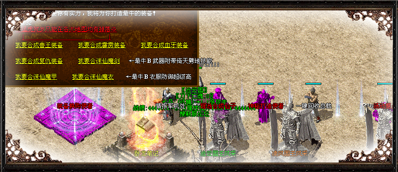 【公告】各个安全区自动喊话的NPC都是假的,系统喊话是红字和蓝字,所以请玩家特别注意不要上当.本服唯一客服无GM 会员命令为:@会员本服是长久服,且在线的玩家,全都是活人,服务器不做那些弄假人增加人气,导致安全区特卡的事,本服也不是快餐服,请那些想两个小时就称霸全服的玩家及家族尽快闪人![151]举报加速及外挂,请点击土城药点左边的NPC,并按照说明进行举报,我们会在第一时间处理,谢谢!!!对于开加速及外挂的玩家,经查实后,直接做封IP处理【公告】服务器提高了全服暴率,一些新地图的怪物暴血牙,而三万点血以上的十几种怪物,暴终极复仇,且暴率非常高,服务器,每天还不定期举行各类活动!!!