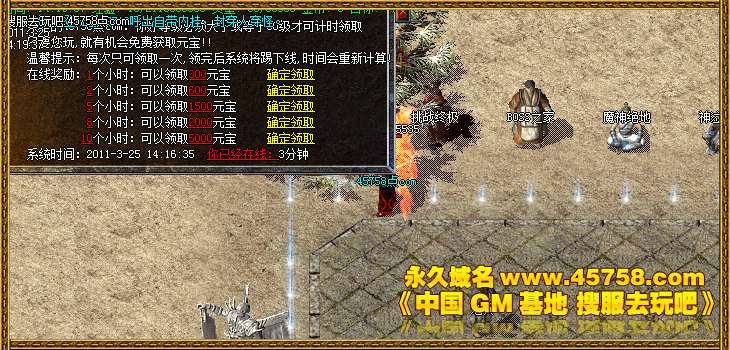 ②:行会争霸:每天下午18点,土城左上角点功城公告牌进入,获胜行会"奖励"元宝!③