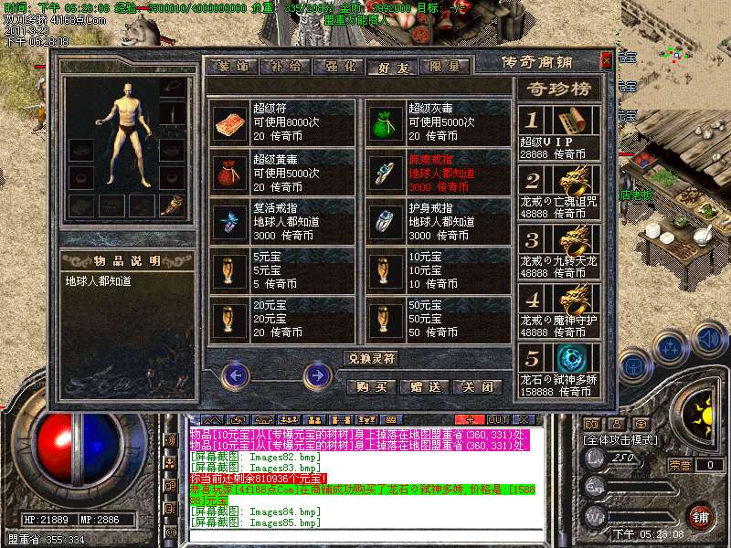 元宝获取:充值元宝送积分换取道具,也可以通过打怪和回收装备获得丰厚的元宝
