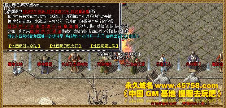 【公告】:⒍本服新增四级技能书.分别为[四级烈火剑法.四级灵魂火符.四级魔法盾]这三件书技.想获得这3本书的唯一方法就是等服务器系统每2个小时出现一次提示.提示您进去此地图.此地图怪物爆书.另外还爆单个单个的字.[可以拿回来到土城技能修炼师处合成]