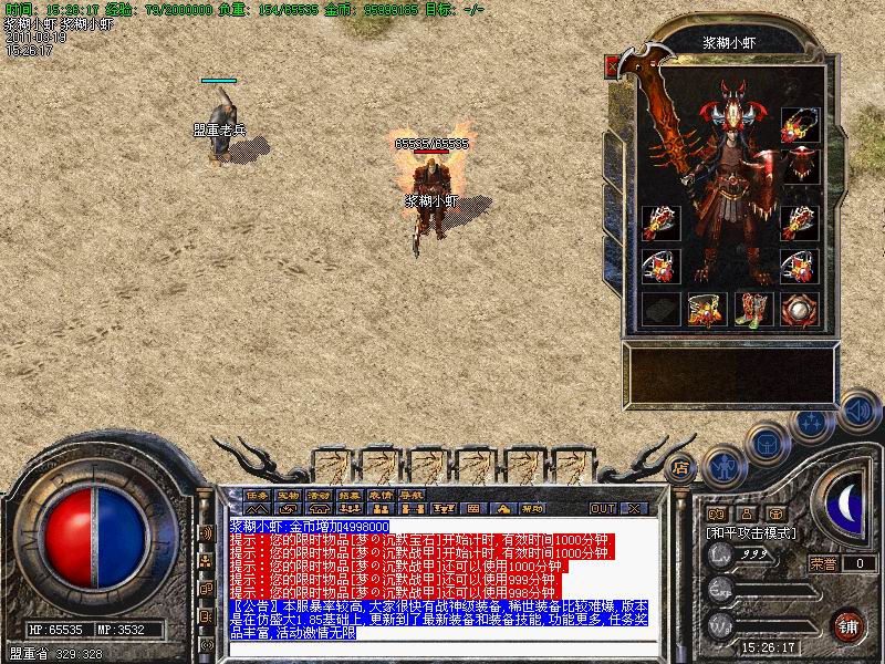本服暴率较高,大家很快有战神级装备,稀世装备比较难爆,版本是在仿盛大1.85基础上,更新到了最新装备和装备技能,功能更多,任务奖品丰富,活动激情无限