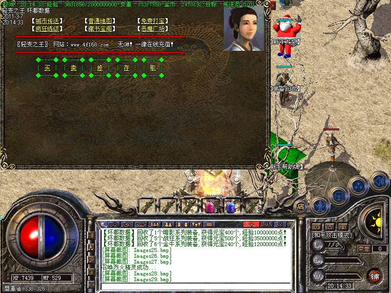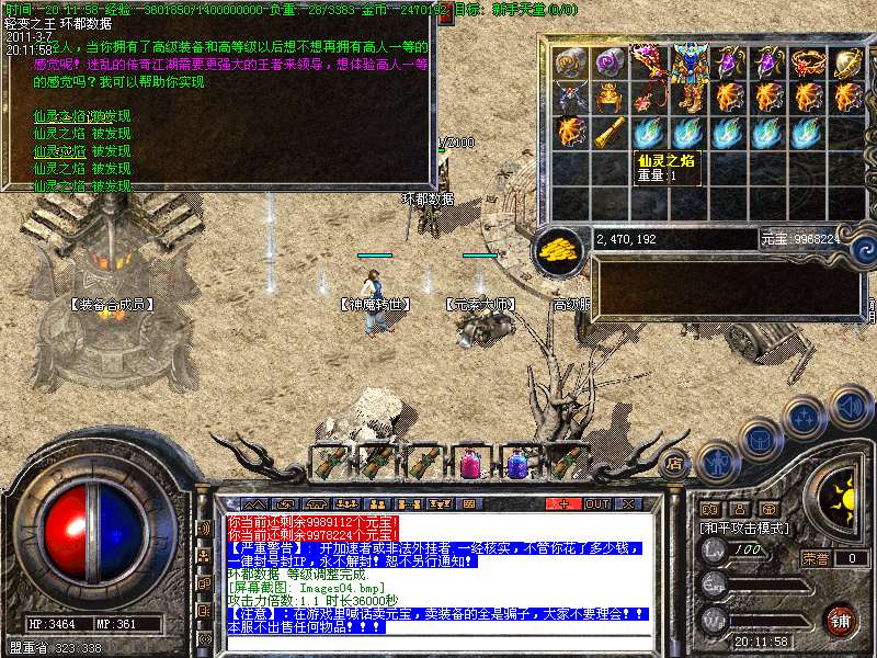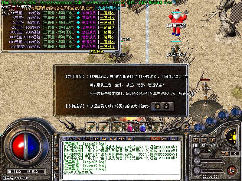 【新手介绍】:非RMB玩家,去[散人激 情打宝]打怪爆装备,可回收大量元宝!可以爆到王者、金牛、战狂、暗影、逍遥装备,斩天装备!新手装备去魔龙城打,练级带3倍经验勋恶魔广场,疯狂练级!