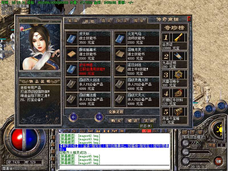 八.【特殊刷新】用魔法神石在土药旁边的魔法结阵可召唤出蚩尤.同时可获得丰富的奖品.--即本服的所有装备都可送出!