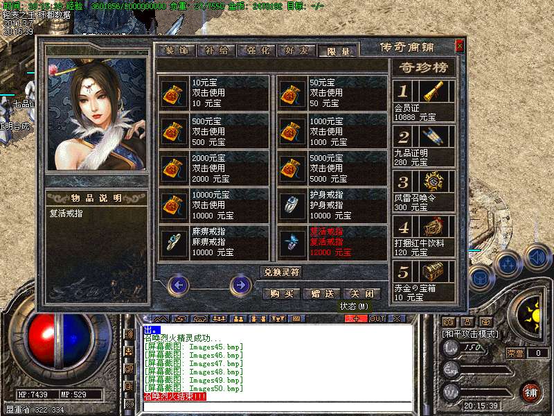 一.【特色活动】蚩尤必暴元素石.需要魔法神石提交,召唤出蚩尤同时可获得丰富的奖品.包括暗影神斩、致命2套装卷、逍遥首饰及武士神石、合成仙丹等大量奖品!