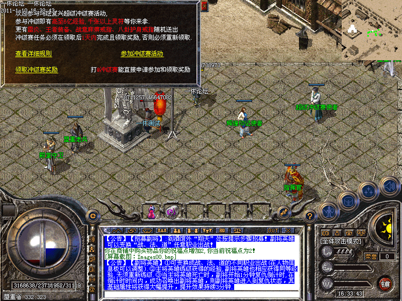 ④:古代遗迹,每小时开启一次,里面刷新各种内功怪物,更有BOSS刷出,是打装备,升级的绝佳去处,里面每15分钟刷新一个冰眼巨魔,多个灵魂收割者以及蓝影刀客,可爆出好装备,土城庆典仙子处可传送进入王者秘境,更可 获得极品星王装备,还有几率爆出极品王者装备