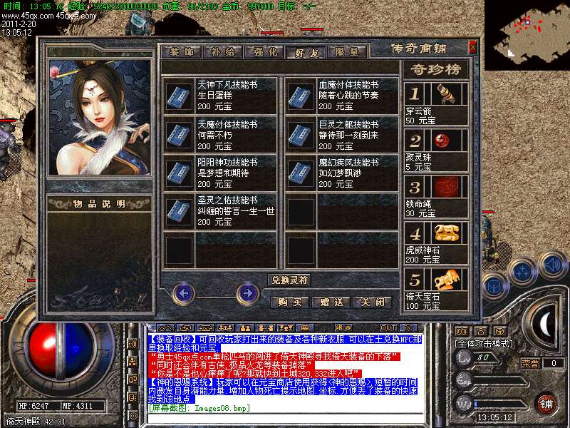 【神的恩赐系统】玩家可以在元宝商店使用获得<神的恩赐>,短暂的时间内激发自身潜能力量.增加人物死亡提示地图.坐标.方便丢了装备的快速找到该地点.