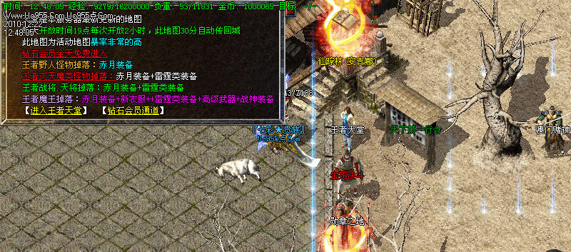 特别地图:王者天堂为打宝天堂,每天15点.19点.0点开放.此地图任何大小怪物都可以有机率暴出赤月类装备和雷霆.战神装备.王者魔王可暴出终极武器!