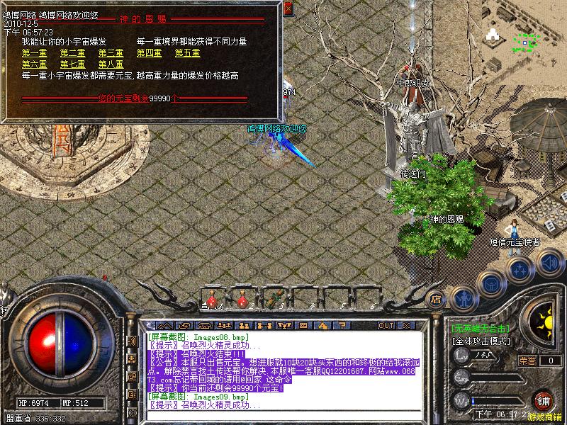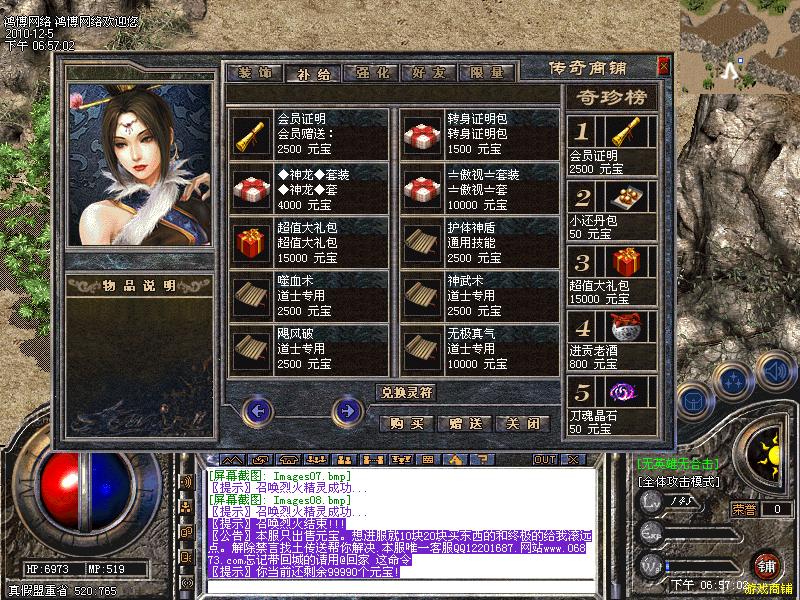 本服务器为:【鸿博网络】,本F已经正式开放了,所有数据都会保留,大家可以尽情的玩!有什么问题随时联系我们的管理QQ:12201687 承诺永不关区!!所有玩家可以自助充值元宝,在土城:343 338 有一个"短信元宝使者",你只要拿起你的手机按照提示发送短信,就可以得到元宝,到屏幕右下方[铺]里购买你想要的东西!