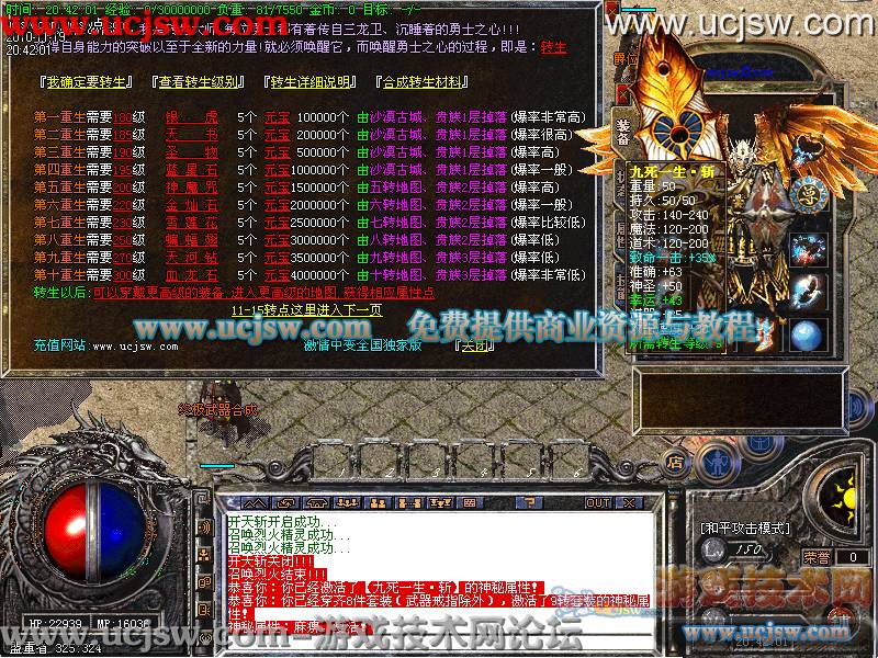 〖提示〗:新手请到土传送员进入 装备圣地 练级圣地 技能圣地 新手1小时绝对可以5转以上 练级圣地怪物掉落10-500不等元宝.新手不会再为元宝发愁咯!