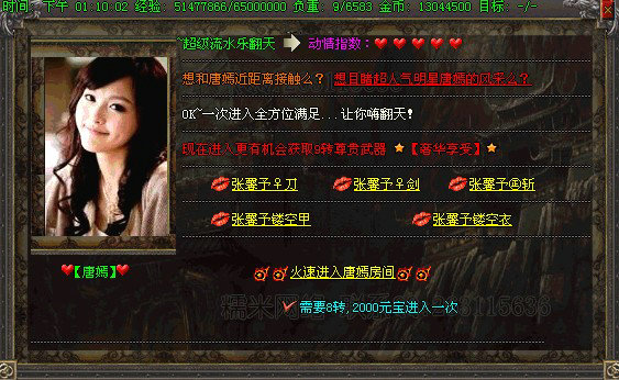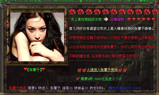 〖公告〗:本服升级泡点地图超多.合理升级环境.芙蓉姐姐房间可以快速升级.也可以去豪华泡点房间.边看美女边体验超速升级的乐趣!!!