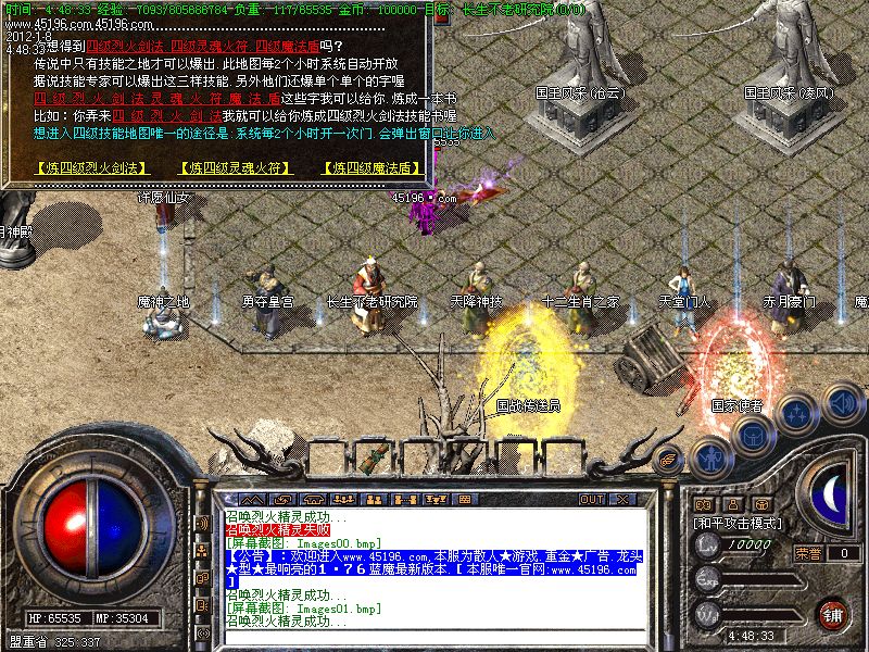 【公告】:⒍本服新增四级技能书.分别为[四级烈火剑法.四级灵魂火符.四级魔法盾]这三件书技.想获得这3本书的唯一方法就是等服务器系统每2个小时出现一次提示.提示您进去此地图.此地图怪物爆书.另外还爆单个单个的字.[可以拿回来到土城技能修炼师处合成]....