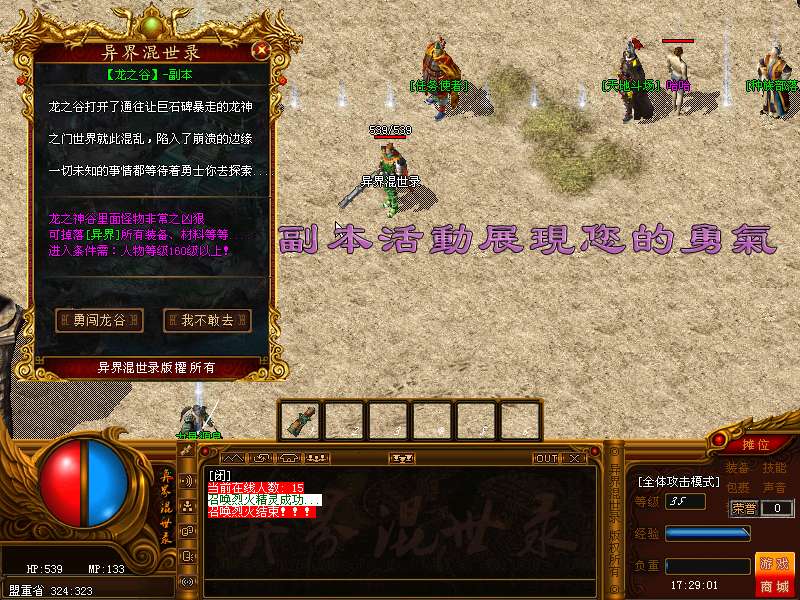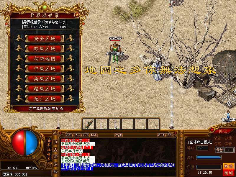 地图介绍:在异界中分练级、初级、中级、高级、死亡等30多张精彩地图.所有地图均为免费进入。练级暂分两个练级方式,初级与高级练级.(都是免费的哦!)注:如果打到双倍经验武器和双倍经验勋章,倍数是可以叠加的,将会产生4倍经验哦,让您享受飞一般的升级感觉!