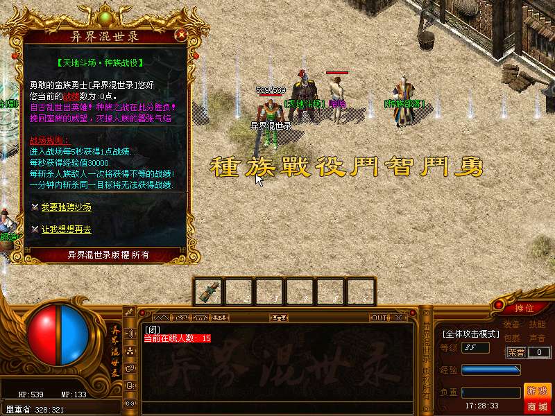 天地斗场:每天多次活动举行种族战役,每次战役时间为30分钟。进入战场每5秒将获得战绩值1点,每秒经验暴涨500000.每斩杀敌对部落族民将获得不等的战绩!死亡人数达到30人将召唤(战场冤魂),爆大量元宝、金刚石、转生证明、物品装备等.