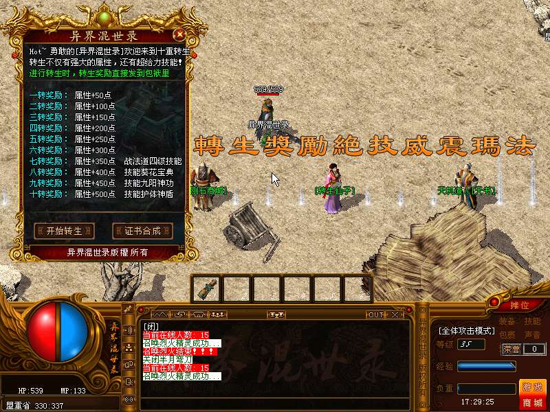 轮回转生:目前转生分十转,转生将奖励四级技能,自创技能!详细请看土转生仙子NPC
