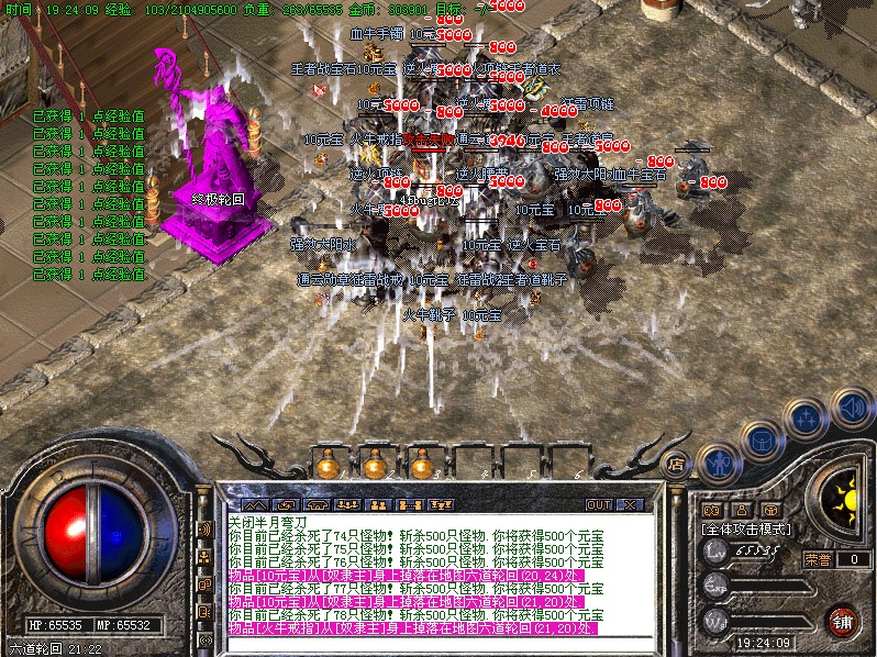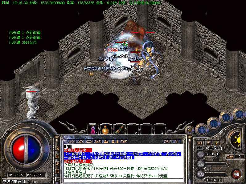 每天一次的活动.斩杀任意怪物500只可获得500元宝的奖励.元宝自动增加在身上.注意查收!