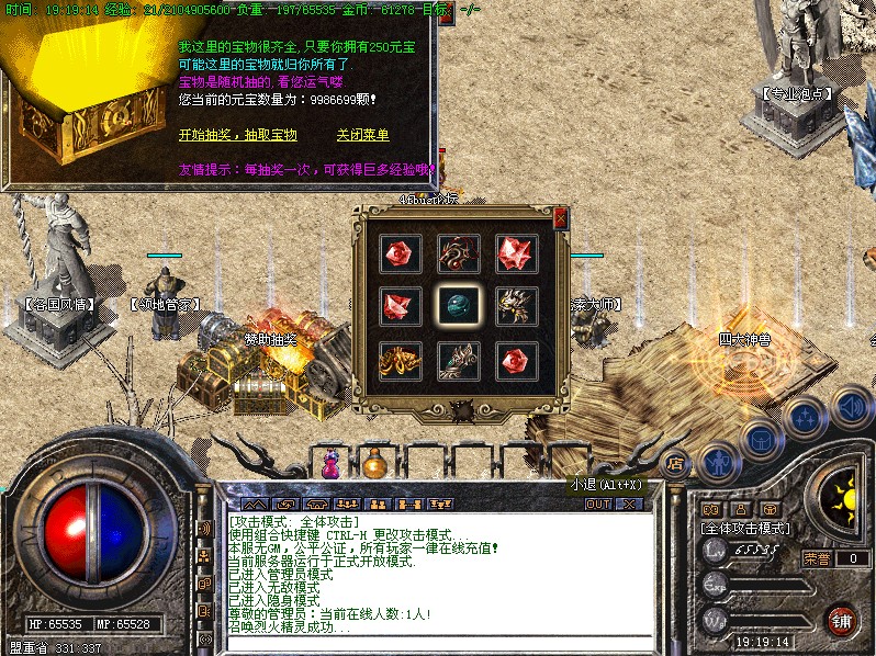 用魔法神石在土药旁边的魔法结阵可召唤出蚩尤.同时可获得丰富的奖品.--即本服的所有装备都可送出!