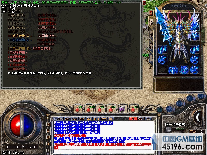 【申明】本服绝对无GM,无客服QQ,游戏里任何形式说自己是GM的全是骗子大家小心上当!!本服元宝比例1:30W 点卡赠送50% 电话充值卡赠送70% 网银赠送%100~~一律使用冲值平台冲值!