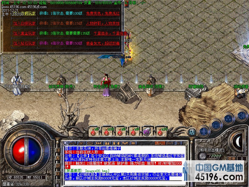 【公告】各个安全区自动喊话的NPC都是假的,系统喊话是红字和蓝字,所以请玩家特别注意不要上当.本服唯一客服无GM