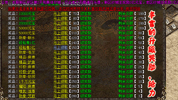 【沙城奖励】本服新区开区第2天则集体攻城,行会老大无需递交头像,新区沙城主奖励3亿元宝,老区沙城主奖励1.5亿元宝。