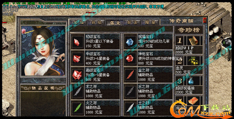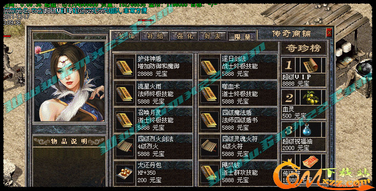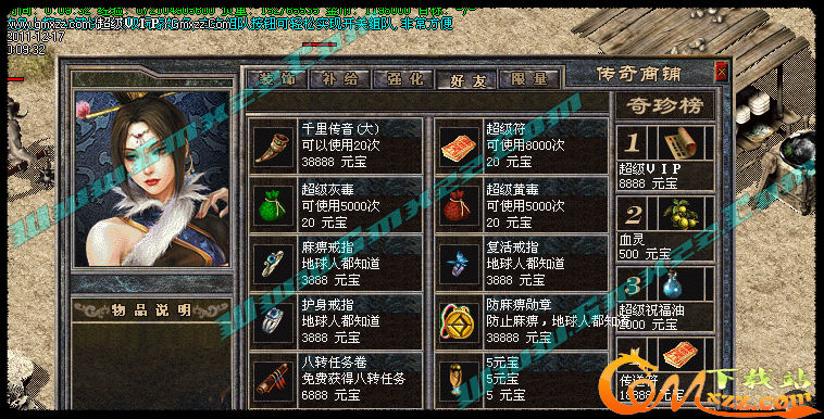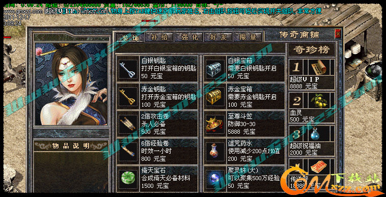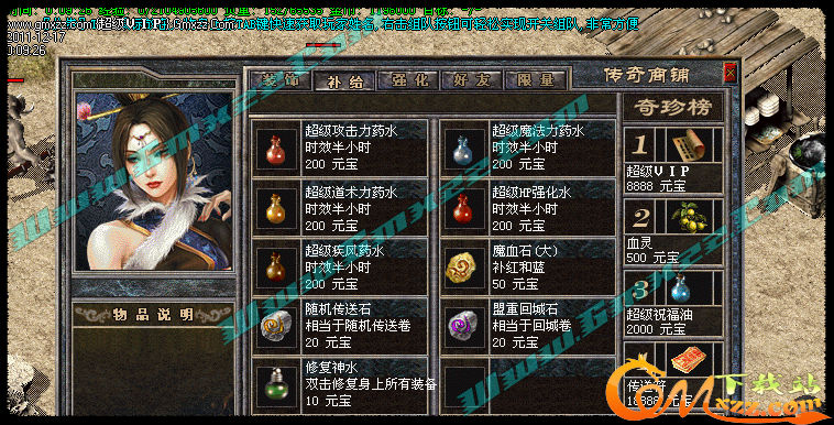 玩家可以拿元宝在[商铺]里购买自己需要的物品.商铺东西很多,全是辅助类物品,没有任何装备出售,