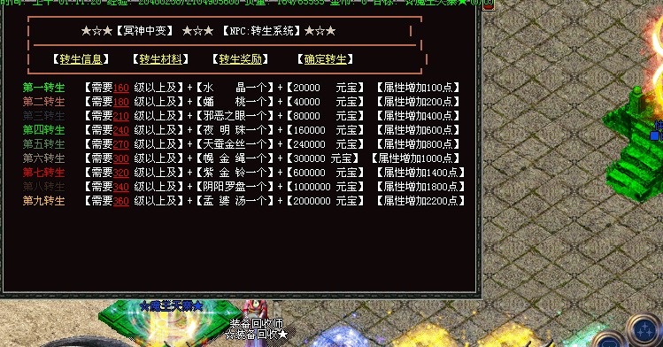 【更新】更新转生系统,1-9转,转生后每转都可以获得相应属性点,每转可获得强悍技能.详情请看转生使者!