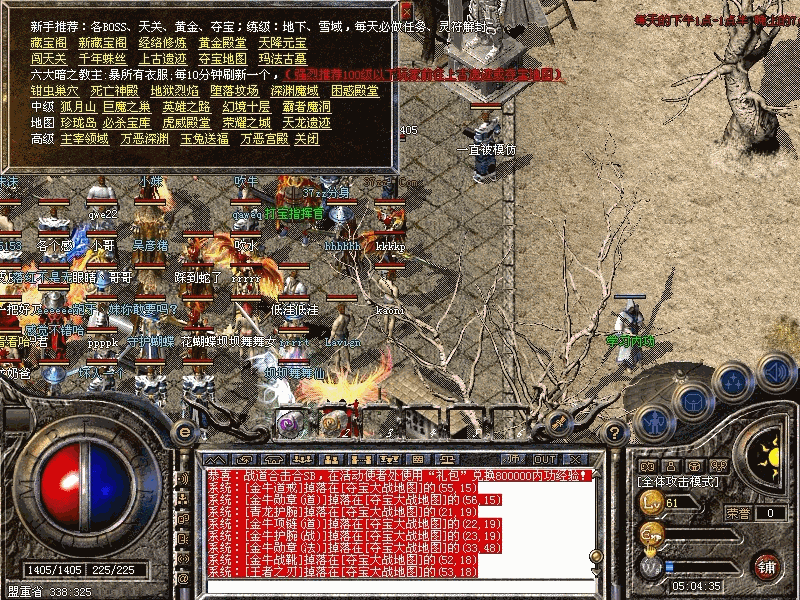 新手打宝地之一:上古遗迹!从盟重安全区右上的打宝指挥官进入,此地图爆率高哦。此地可爆:星王、灵虚星王、王者、金牛、炎龙系列