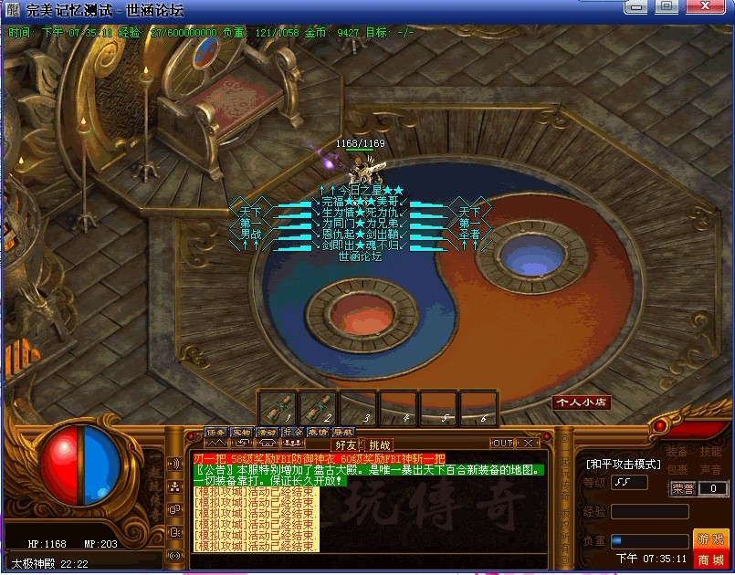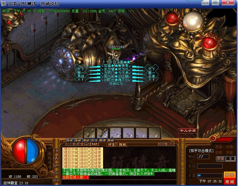 <255,220>〖公告〗欢迎进入本传奇,我们力争保证:公平,公证,公开,认真对待每一个玩家。本游戏不设管理员,不卖装备,不调级,只出售元宝,为广大的玩家创造一个自己当家做主的传奇人的天堂!