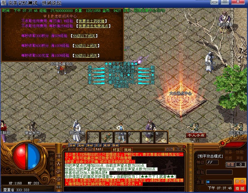 〖公告〗本服升级特别介绍.免费泡点玩家可以泡到52级就不能进入了.增加了积分泡点。积分是怎么来的呢?就是充值元宝比例1.2000.那么积分同元宝比例一样.最高等级为80级。60级以后等级经验为4亿是50级同等经验。.增加了系统织自动奖励.53级奖励黄金精品战甲1件.55级奖励黄金之刃一把.58级奖励FBI防御神衣 60级奖励FBI神斩一把