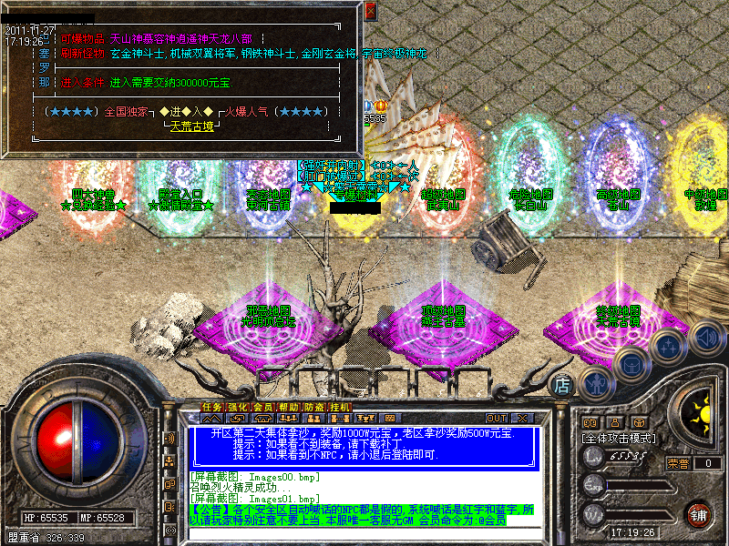 【更新】新增地图【苗疆】打材料,打元宝的好地方!【敦煌】【长白山】【苍山】【武夷山】【束河古镇】【光明顶总坛】【燕王古墓】【天荒古境】所有地图都均由相应的装备!!想要好装备就得靠自己努力的寻找.注意:BOSS能报终极装备,怪物强悍凶猛.建议组队前往
